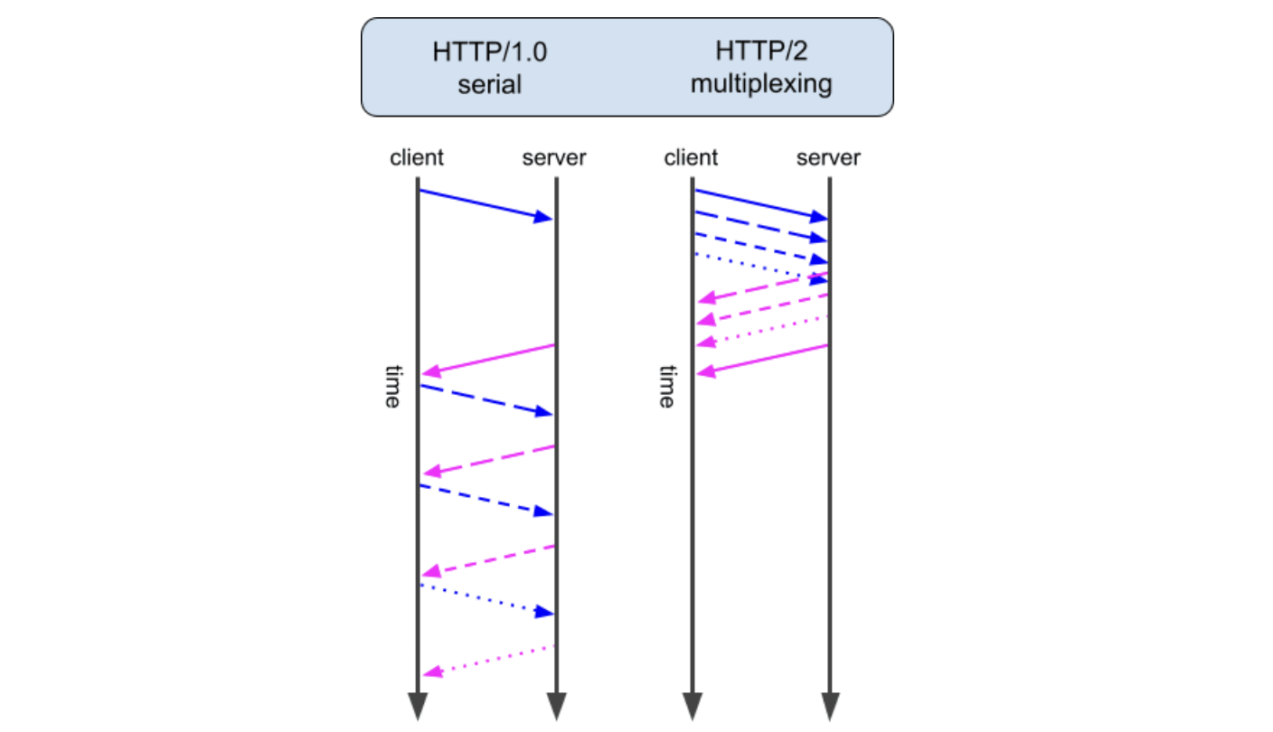 멀티플렉싱 기능 덕분에 요청들이 동시 처리되어 전체 페이지 로딩 속도가 개선됨 - 한 페이지 내 이미지, JS, CSS 등 수십 개의 리소스를 병렬로 처리 가능