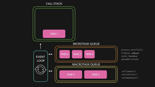 - Event Loop는 한 번의 루프에서 오직 하나의 Macro Task만 실행