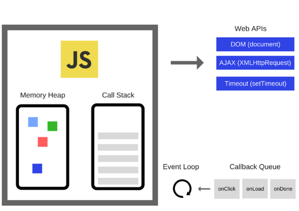 여러 외부 요소(Web APIs, 이벤트 루프 등)와 함께 작동한다.