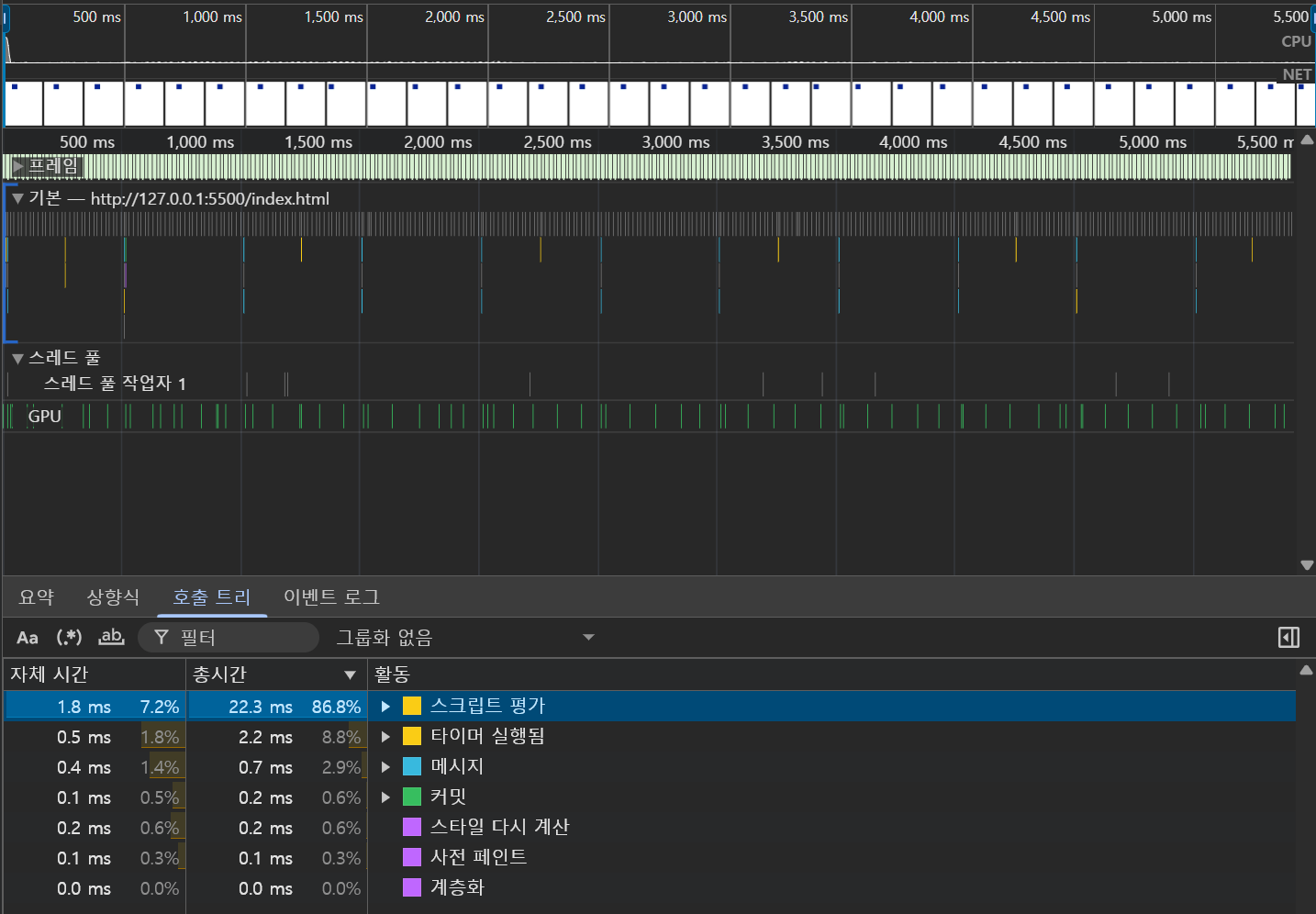 이 또한 동일한 환경에서 확인을 해야하기 때문에 성능 탭을 통해 5초를 측정해보았다.