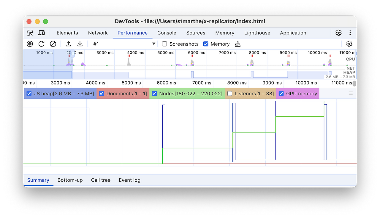 JS 힙(HEAP) 그래프와 DOM 노드 카운터를 계속 추적합니다. 이때 그래프가 계속 상승한다면 메모리 누수가 있을 가능성이 높습니다.