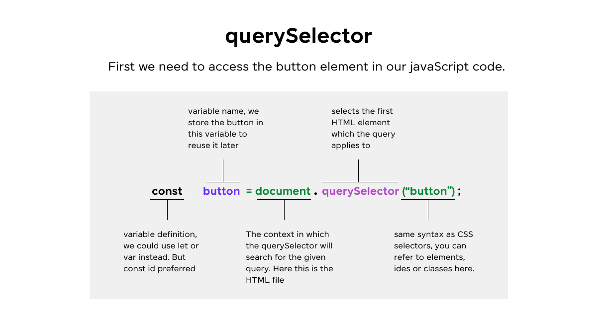 TIP: document.querySelector()는 DOM 트리를 순회하므로 너무 자주 호출하면 퍼포먼스에 영향 줄 수 있어요. 중복 선택은 피하는 게 좋습니다.