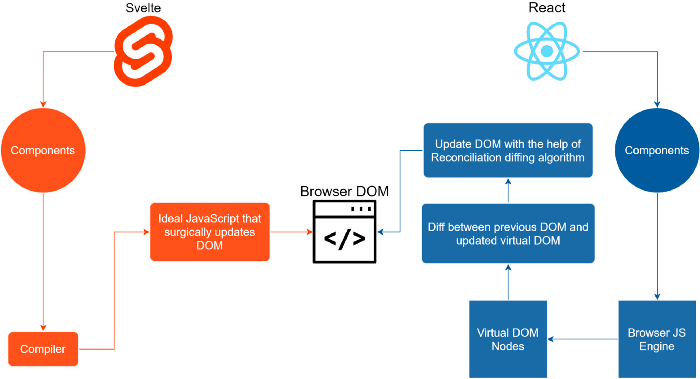 .svelte 파일로 작성한 코드는 빌드 과정에서 최소한의 바닐라 JS로 변환되고, 이후에는 어떠한 런타임도 필요 없이 브라우저에서 바로 실행됩니다. 그렇기 때문에 런타임 오버헤드가 거의 없고, 번들 크기도 작으며, 동작 속도 또한 매우 빠르다는 장점이 있습니다.