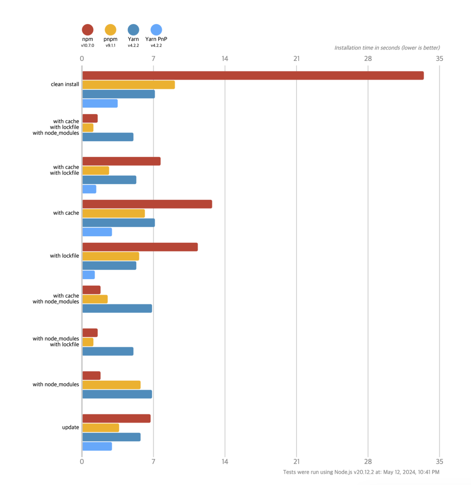 pnpm은 전반적으로 빠르고 캐시 기반 재설치에 좋은 성능을 보여주고 있습니다.