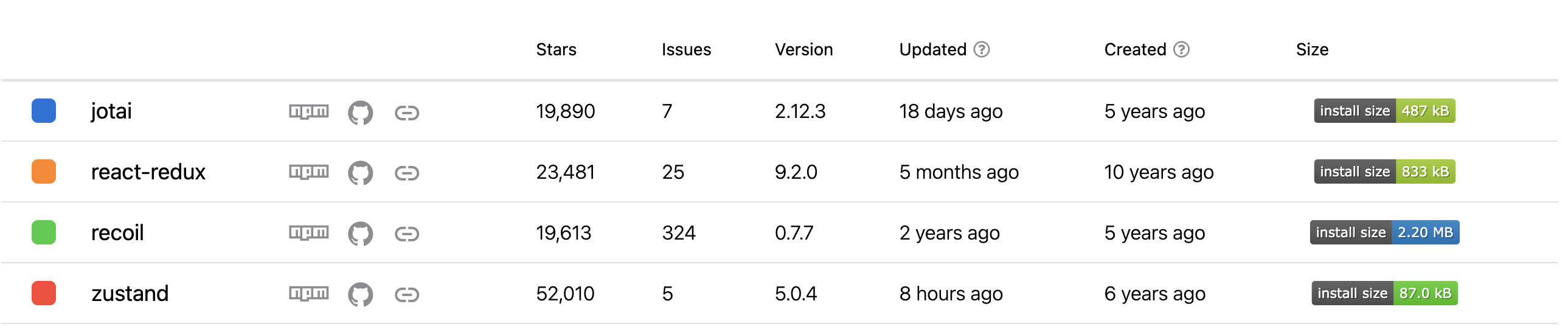 대규모 프로젝트, Redux에서 마이그레이션을 진행하는 경우라면 Zustand, 비교적 작은 프로젝트며 Recoil를 사용했다면 Jotai를 사용하는 것을 권장드려요 :)