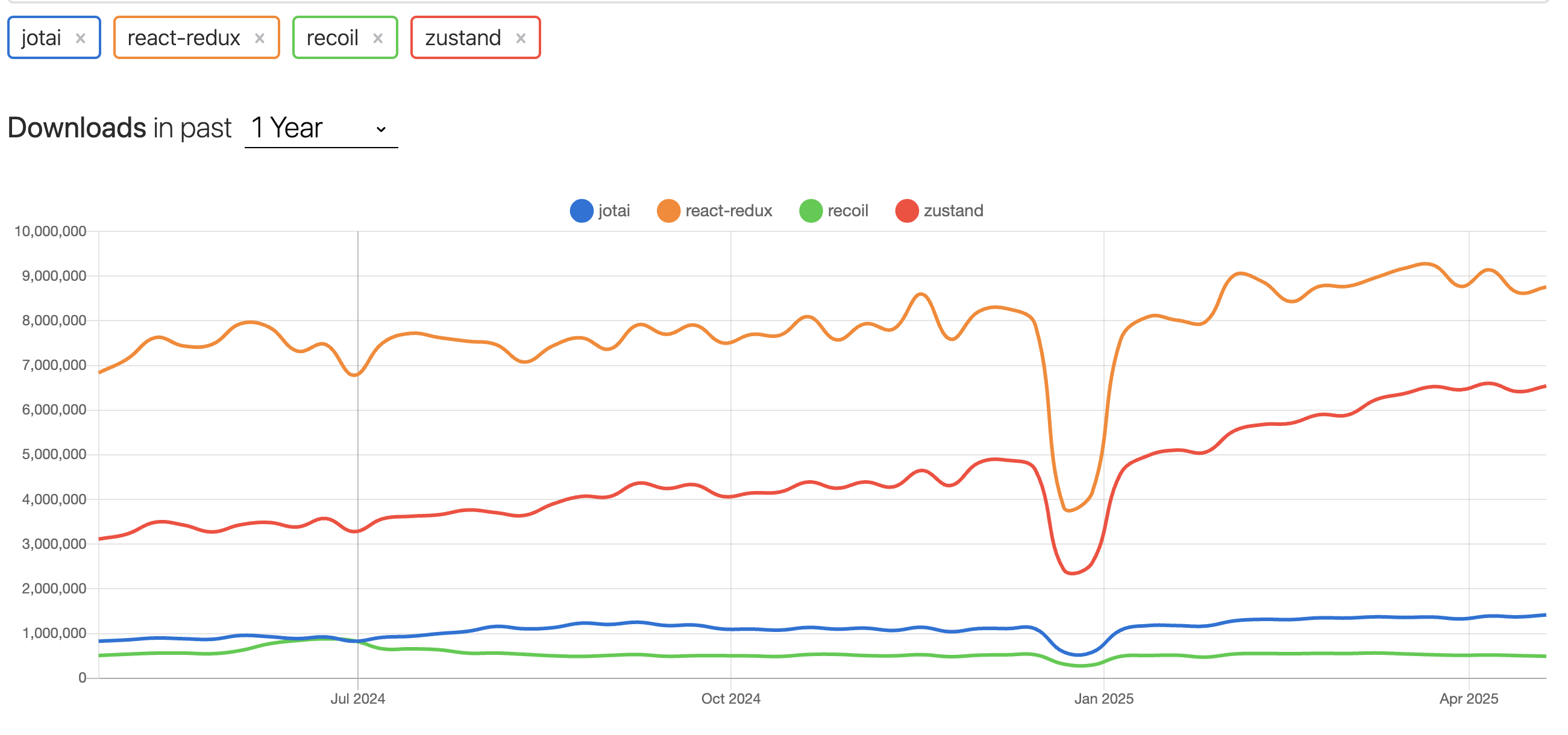 Jotai와 Recoil은 Atomic 패턴, Zustand와 Redux는 Flux 패턴을 사용해요.