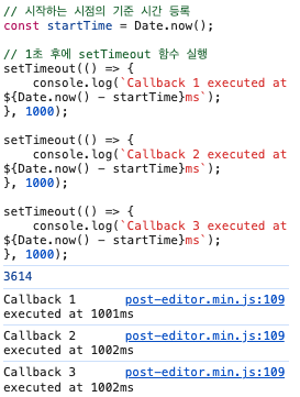 각 콜백 내부에서 시작 시간과 현재 시간 사이의 차이를 구해서 각 콜백이 얼마나 정확한 시간에 실행되는지 확인해볼 수 있는 코드입니다